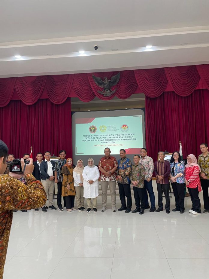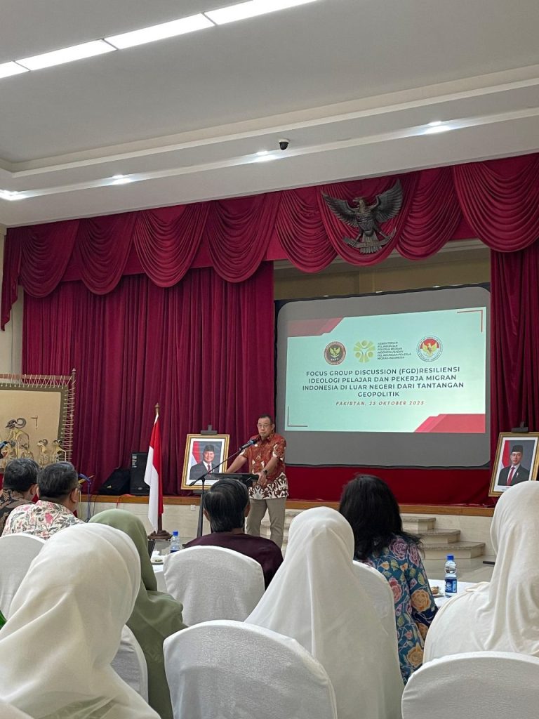 Islamabad, 25 Oktober 2025 — Pada hari Sabtu, 25 Oktober 2025, Kedutaan Besar Republik Indonesia (KBRI) Islamabad menjadi tuan rumah penyelenggaraan Forum Group Discussion (FGD) yang diprakarsai oleh Komisi Perlindungan Pekerja Migran Indonesia (KP2MI) dan Badan Nasional Penanggulangan Terorisme (BNPT). Kegiatan ini mengangkat tema “Resiliensi Ideologi Pelajar dan Pekerja Migran Indonesia di Luar Negeri dari Tantangan Geopolitik.”